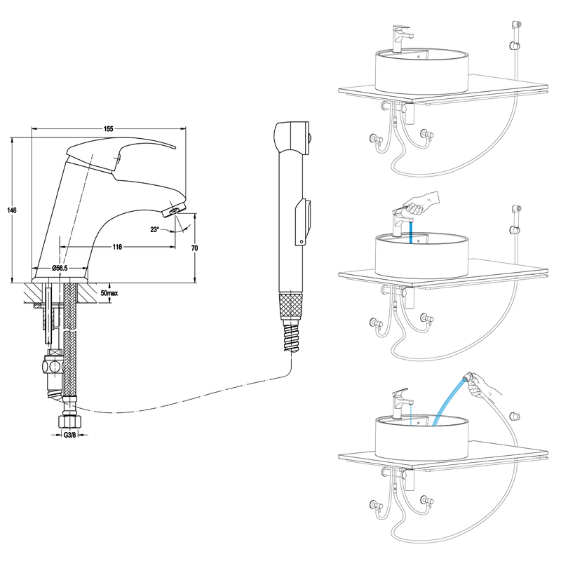 A csomag tartalma: csaptelep, bidézuhany, 150 cm hosszú fémcső és falra szerelhető tartó