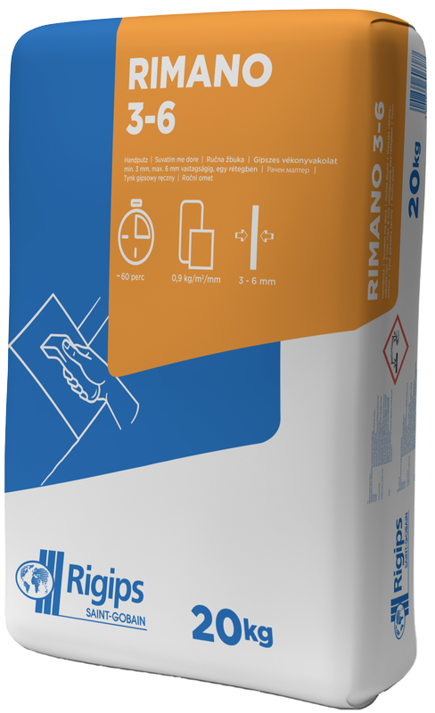 Gipszes, finomszemcsés beltéri vékonyvakolat. A bedolgozás nem igényel drága gépi berendezést, ugyanis kézzel vagy keverőszárral a szárazkeverék egyszerűen bekeverhető. A Rimano 3-6 egy finomszemcsés vékonyvakolat relatív sík, nedvszívó felületek glettelésére. Megfelelő alapfelületek például a zsaluzott betonfelületek, vagy a gázbeton-szerkezetek.