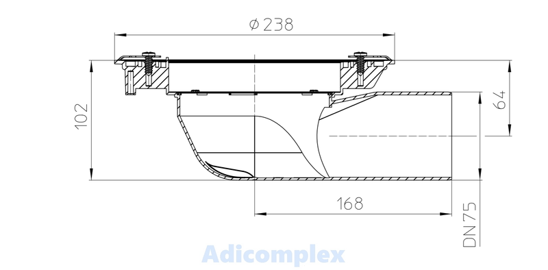 Terasz- és balkonlefolyó test DN75 oldalsó csatlakozóval, betonozó sablonnal