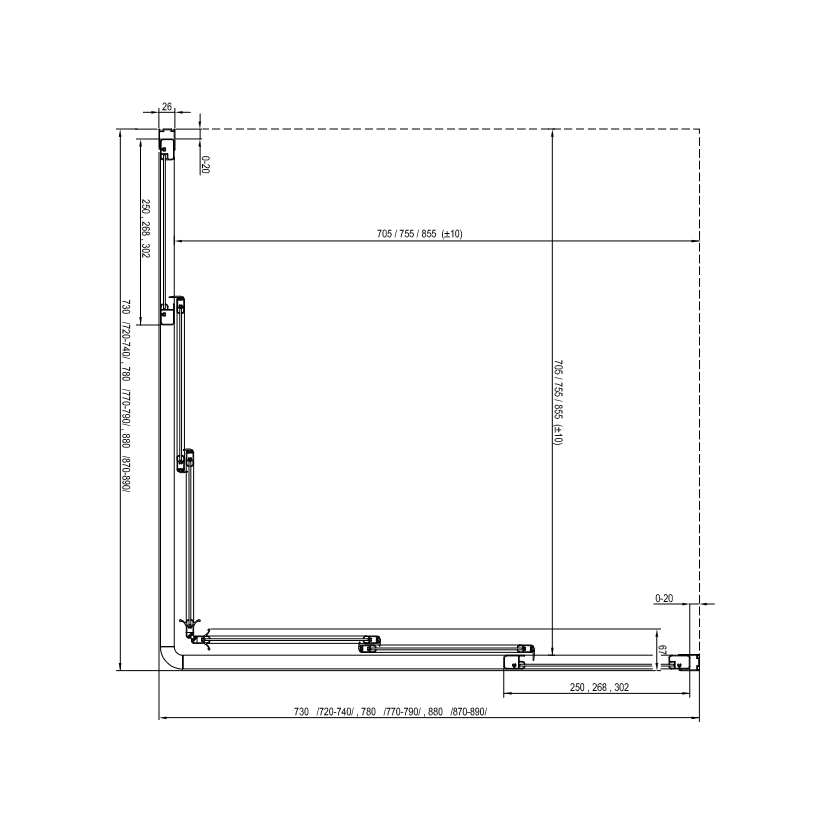 Egy teljes zuhanykabin kialakításához két darab ASRV3 tolóajtó szükséges, a sarokelem minden csomagolás tartozéka. Mindkét rész különböző méretének kombinációjával négyzet vagy téglalap alapú zuhanykabint alakíthatunk ki (pl.: 75 x 90 cm, 80 x 90 cm és így tovább).