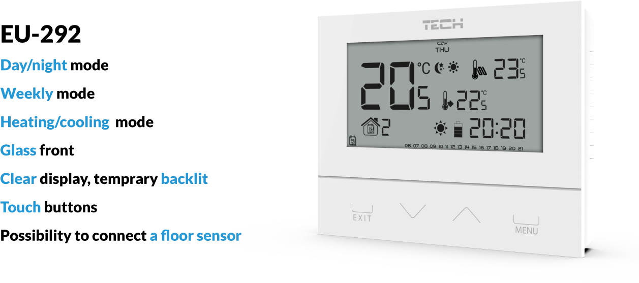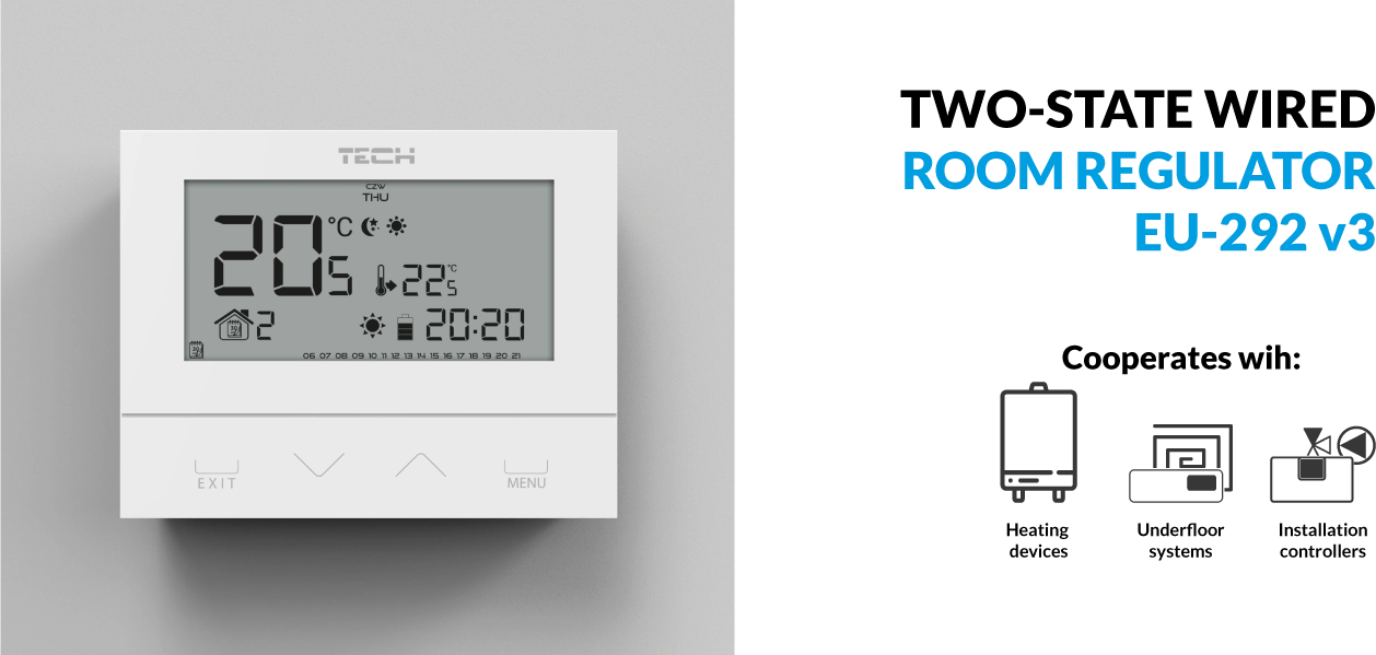 Az EU-292v3 szobatermosztát fűtőberendezés (például gáz-, olaj-, elektromos kazán vagy kazánvezérlő) vezérlésére szolgál. Úgy tervezték, hogy fenntartsa a beállított hőmérsékletet a lakásban azáltal, hogy egy jelet küld a fűtőberendezésnek (érintkezőnyílás), amely információkat tartalmaz a helyiség további fűtéséről a kívánt hőmérsékletre.