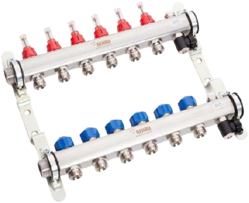 Visszatérő beépített termosztatikus szelepbetétekkel az egyes fűtő ill.hűtőkörök elzárásához,kék kézi elzáró,szelepek a REHAU MINI termoelektromos szelepfejekhez.