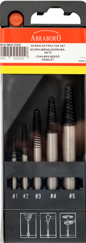 Abraboro csavarkiszedő készlet - 5 részes Beszakadt csavarok eltávolításához.