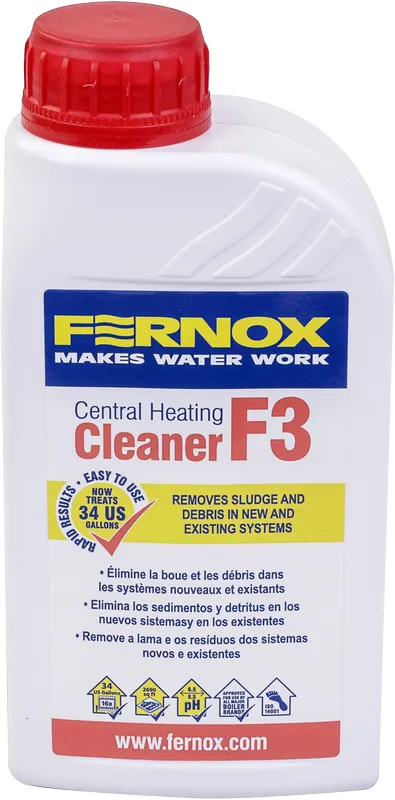 A Cleaner F3 egy hatékony pH-semleges, nem habzó tisztító folyadék, amely eltávolítja az iszapot, vízkövet és törmelékeket a fűtési rendszerből. Optimalizálja a fűtés hatékonyságát és megszüntetheti a kazánzajt. Új rendszer szerelése után a Cleaner F3 ideális a folyatószer maradványainak és más hasonló részecskék eltávolításához, megnövelni a kazán élettartamát. A fűtésrendszer gép mosása során használható a tisztítási folyamat gyorsítására. Nem veszélyes termék, kompatibilis a fűtési rendszerekben használatos összes fémmel, beleértve az alumíniumot is.