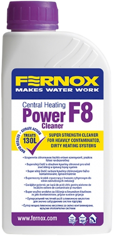 A Power Cleaner F8 egy pH-semleges, citromsav alapú tisztítószer, mely erősen vízköves és iszapos lerakódásokkal szennyezett fűtésrendszerek tisztítására szolgál. Ideális időszakos karbantartásokhoz és a kazáncsere alkalmával esedékes rendszermosáshoz. Erős, és nagyon hatékony összetételének köszönhetően jelentősen meggyorsítja a fűtésrendszermosó gépekkel végzett munkát. Egy 500 ml-es újrahasznosítható flakon elegendő egy akár max. 130 literes rendszer, (16 radiátor) vagy 250 m2-es padlófűtés kezelésére. Mivel pH-semleges, a mosási folyamat végén elegendő egy általános tisztavizes öblítés, semlegesítő adalék használatára nincs szükség. Nem habzik. A fűtőrendszerekben általánosan használt összes fémmel és anyaggal használható, beleértve az alumíniumot is.