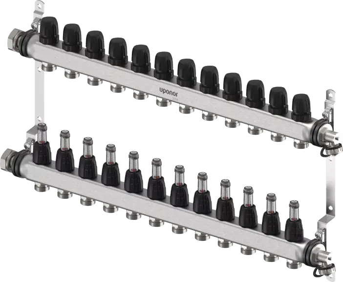 Áramlásmérős osztó-gyűjtő rozsdamentes acélból. Jellemzően padlófűtési célokra alkalmas