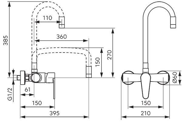 Cserélhető kifolyócső. 150 mm-es kötéstáv.