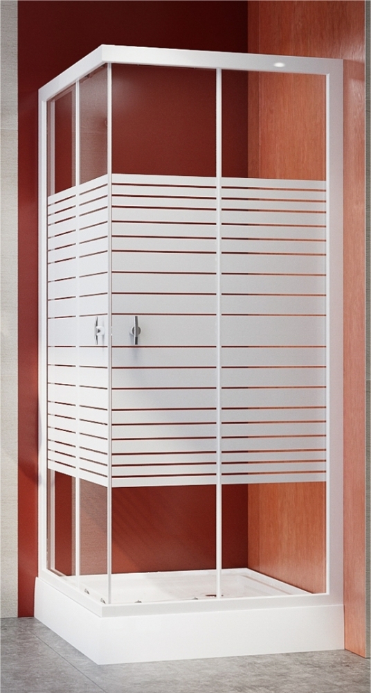 Szögletes sarokkabin zuhanytálca nélkül 90x 90 cm, 185 cm magas. Fehér profilok Keskeny csíkos 5 mm biztonsági üveg. Mágneses ajtózár. Görgős ajtónyitás.
