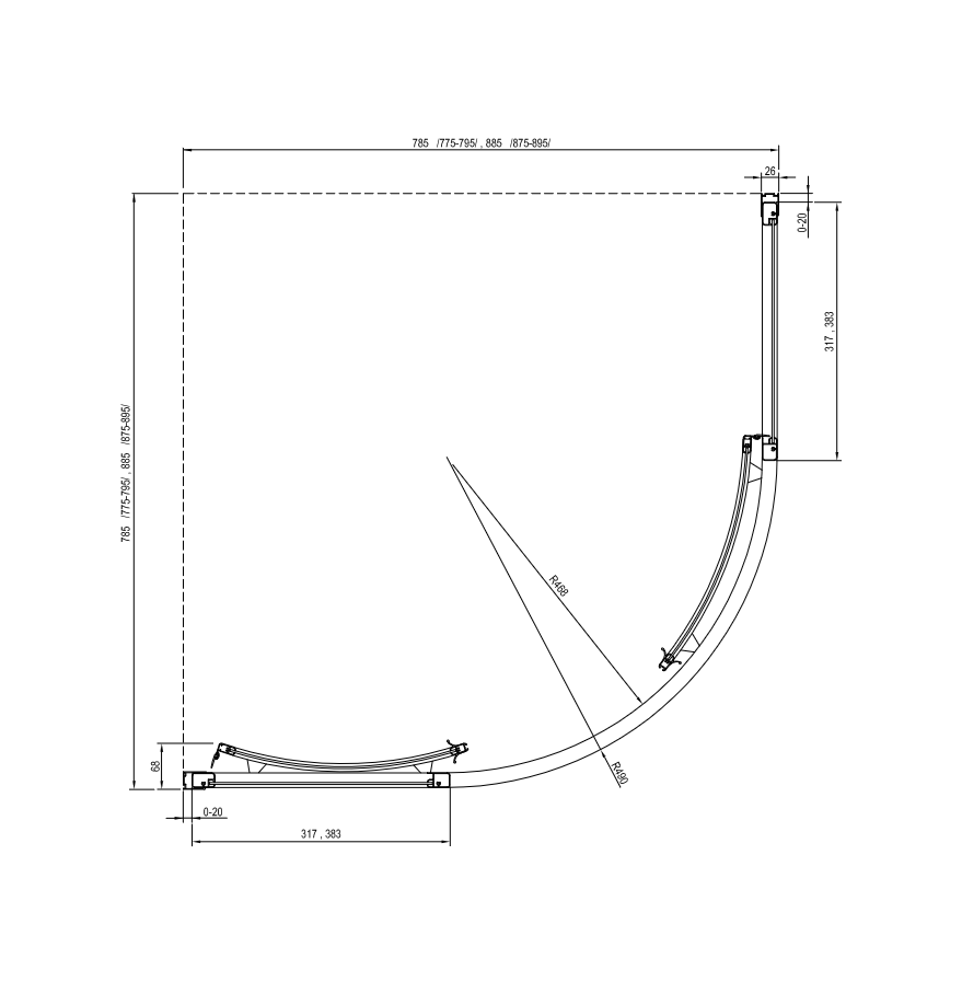 A zuhanykabin a fürdőszoba lecsempézett sarkába RAVAK Ronda, Elipso, Elipso Pro, Elipso Pro Flat, Elipso Pro Chrome zuhanytálcákra vagy közvetlenül a zuhanyfolyókával vagy padlóösszefolyóval rendelkező lecsempézett padlóra telepíthető.