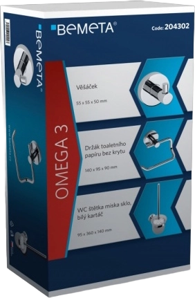 Sapho Bemeta Omega fürdőszobaszett: fogas, WC-papírtartó, WC-kefetartó fehér kefével