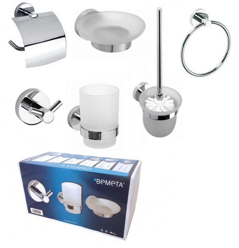 Sapho Bemeta Omega fürdőszobaszett: dupla fogas, WC-papírtartó, WC-kefetartó fehér kefével, törölközőtartó, szappantartó, fogkefetartó
