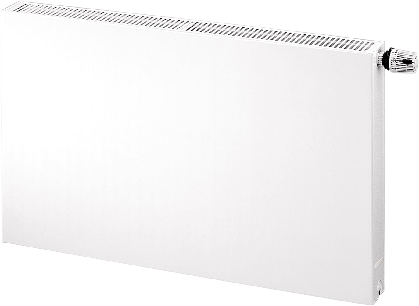 Sík előlappal, konvektorlemezzel és beépített termosztatikus szeleppel szerelt lapradiátor, lefedésekkel. 6 pont csatlakozású radiátor, 1/2" bekötési csonkokkal.