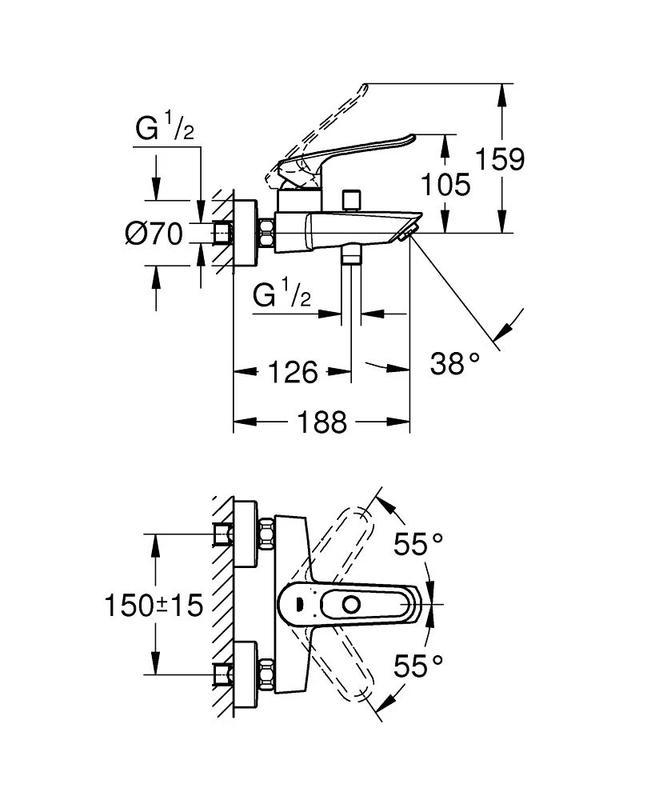 Grohe Eurosmart kádcsaptelep fali kivitel, lyukas fém fogantyúval