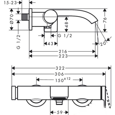 Hansgrohe Vivenis fali, egykaros kádtöltő- és zuhany csaptelep, zuhanyszett nélkül matt fekete