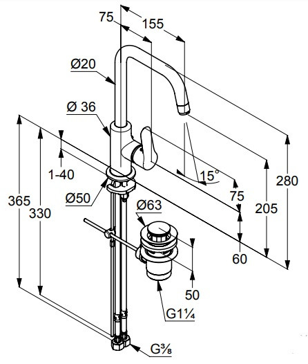image-1219aeb7.png Alca A390 Click-Clack mosdó leeresztőszelep 5/4", túlfolyóval, fémből, nagy dugóval