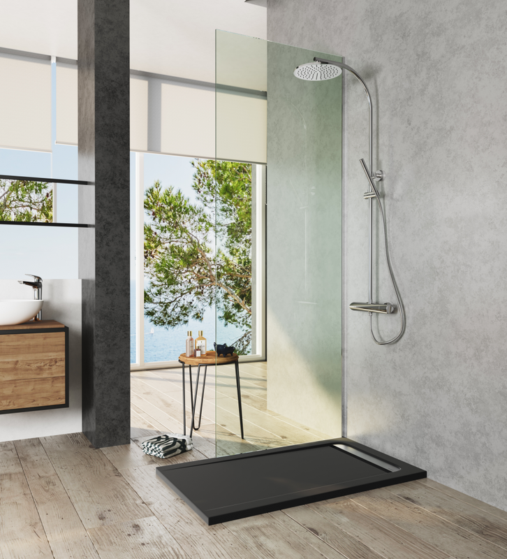 Króm színű, termosztátos zuhanyoszlop, minimalista kialakítással.