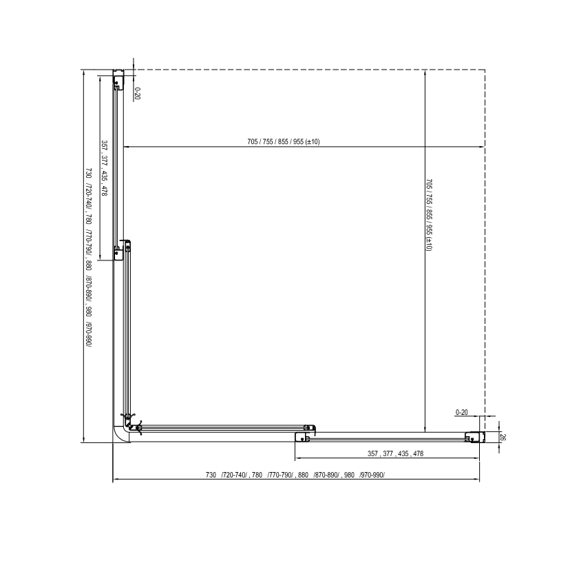 Egy teljes zuhanykabin kialakításához két darab SRV2-S tolóajtó szükséges. Mindkét rész különböző méretének kombinációjával négyzet vagy téglalap alapú zuhanykabint alakíthatunk ki (pl.: 75 x 90 cm, 90 x 90 cm, 80 x 100 cm és így tovább).