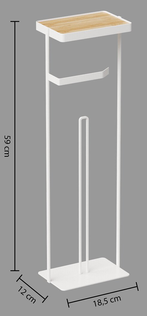 Fehér, szabadon álló toalettpapír-tartó, amely mobiltelefon tárolására is alkalmas. Kombinálja ezt a toalettpapírtartót egy WC-kefetartóval, hogy stílusos megjelenést kölcsönözzön WC-jének vagy fürdőszobájának. A tartó fémből és egy fa telefontáblából készült. A tartóban akár 3 tekercs papír is elfér. Méretek: 18x12x59,2 cm.