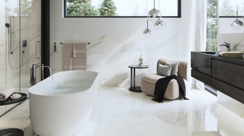 Fehér, fényes, márványhatású,rektifikált fürdőszoba,
