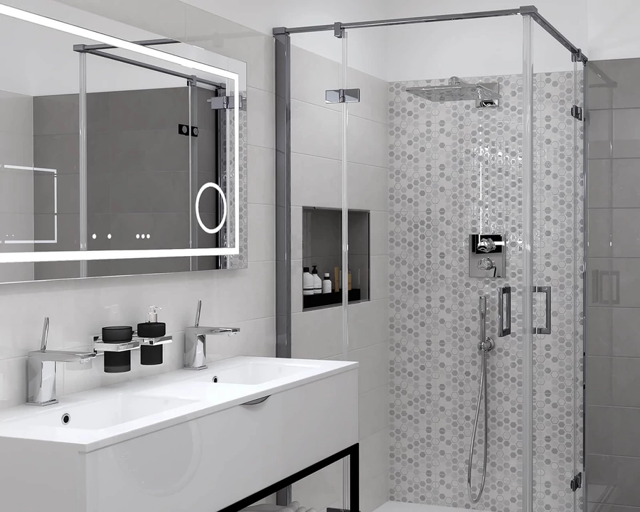 Fényes világosszürke modern hatású fürdőszoba, konyha csempe.