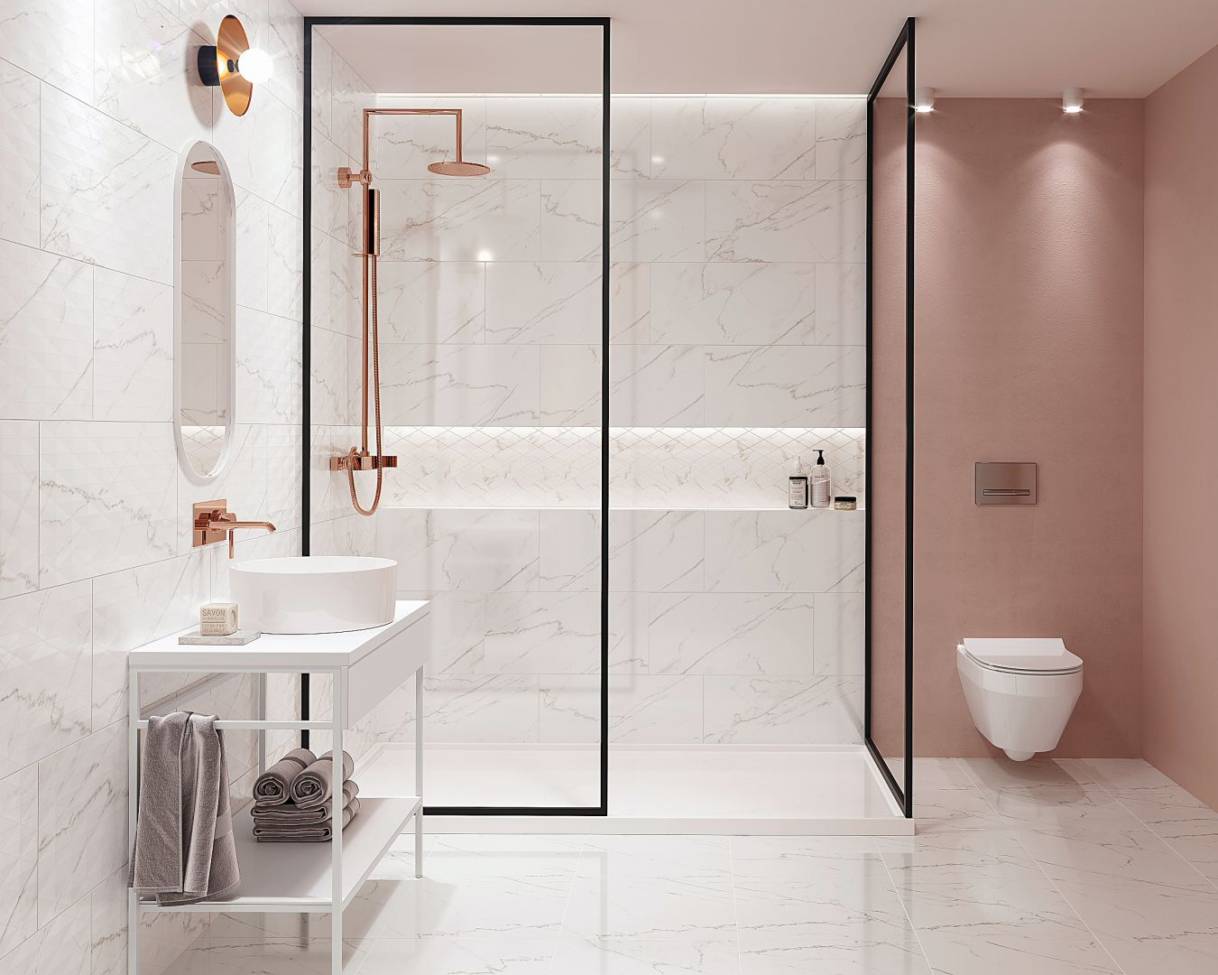 akik egy csipetnyi fényűzést keresnek. A fehér márvány hatású csempék finom eleganciát hoznak fürdőszobánkba,
