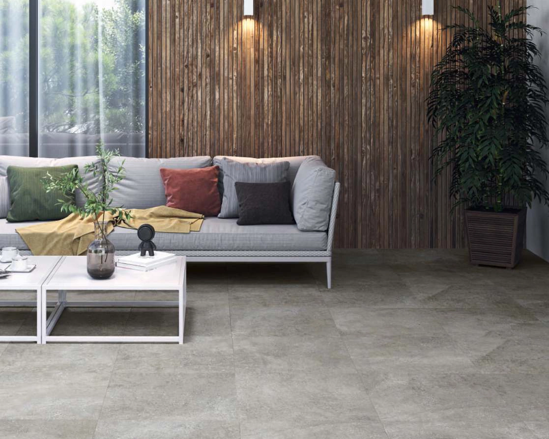 Szürke színű matt, rektifikált, fagyálló, 2 cm vastagságú kültéri gres padlólap. R11-es csúszásmentesség.