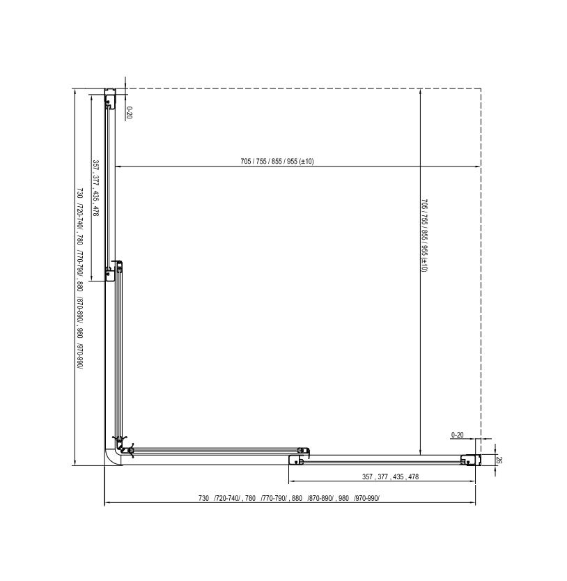 Egy teljes zuhanykabin kialakításához két darab SRV2-S tolóajtó szükséges. Mindkét rész különböző méretének kombinációjával négyzet vagy téglalap alapú zuhanykabint alakíthatunk ki (pl.: 75 x 90 cm, 90 x 90 cm, 80 x 100 cm és így tovább).