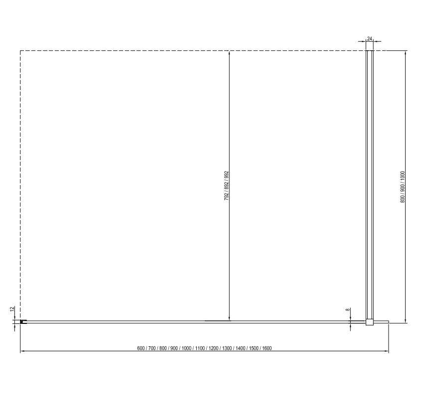 A Walk-In Wall termékek a következő méretváltozatban elérhetőenk: 60/70/80/90/100/110/120/130/140/150/160 cm,