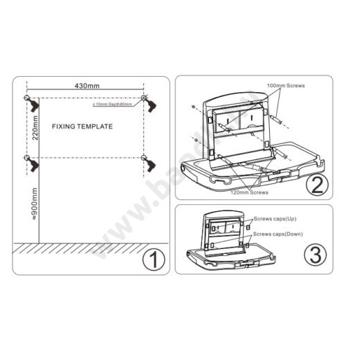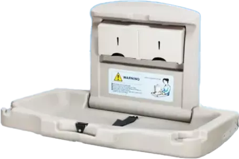 Falra szerelhető, lehajtható pelenkázó asztal polietilénből. A termék felhajtott állapotában mindössze 11 cm-re áll el a faltól.