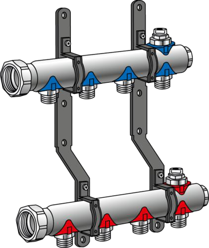 Az elosztócsonk végei zárva, a csatlakozók 1"-os, lapos tömítésű, nem porózus, sárgarézből.