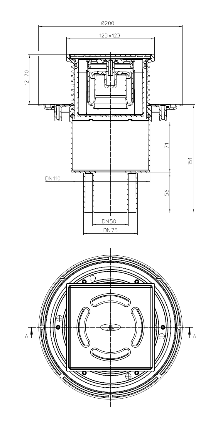 HL310Prblue Padlólefolyó DN50/75/110 függőleges kimenettel, szigetelő karimával, "Primus blue" bűzzárral