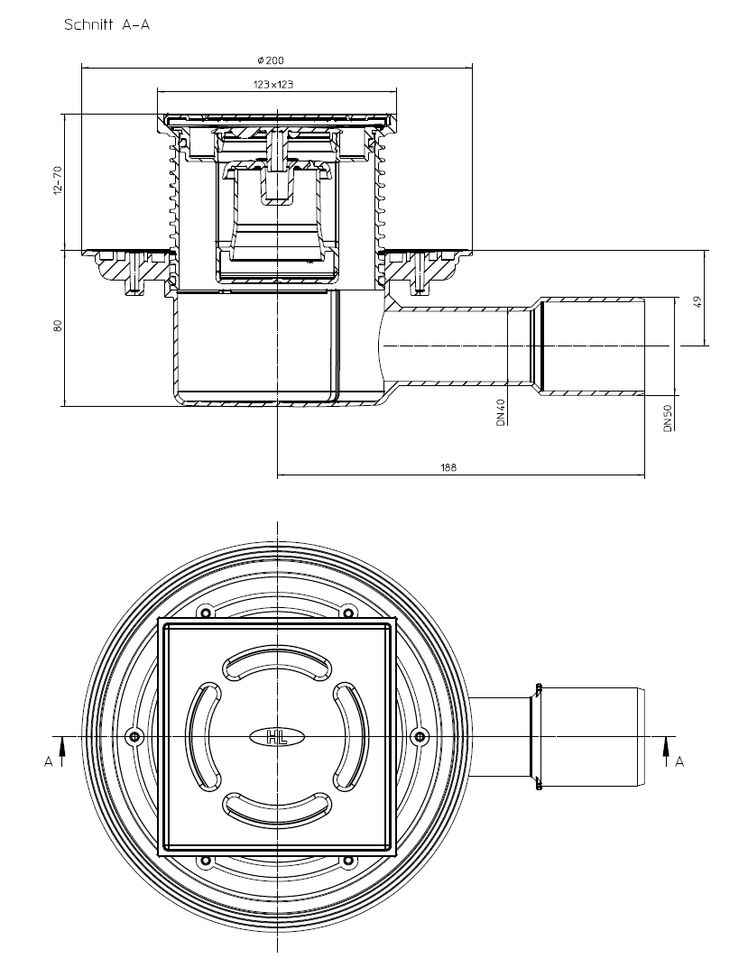 HL510Prblue Padlólefolyó DN40/50 vízszintes kimenettel, szigetelő karimával, "Primus blue" bűzzárral,