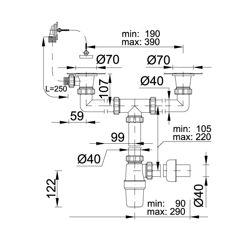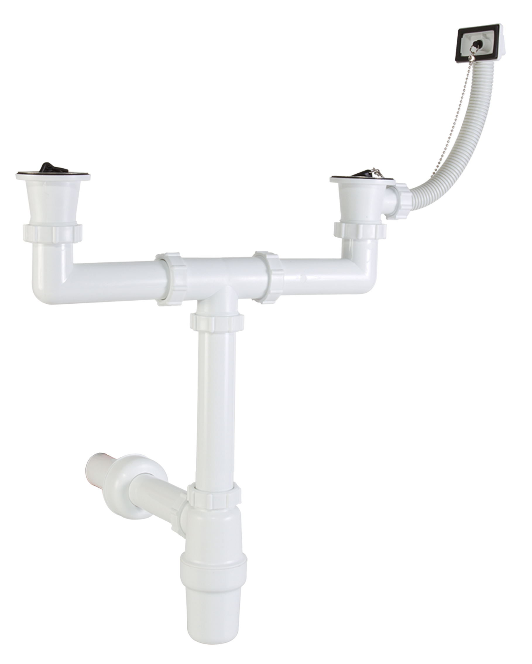 Kétmedencés mosogató szifon 2 leeresztőszeleppel,