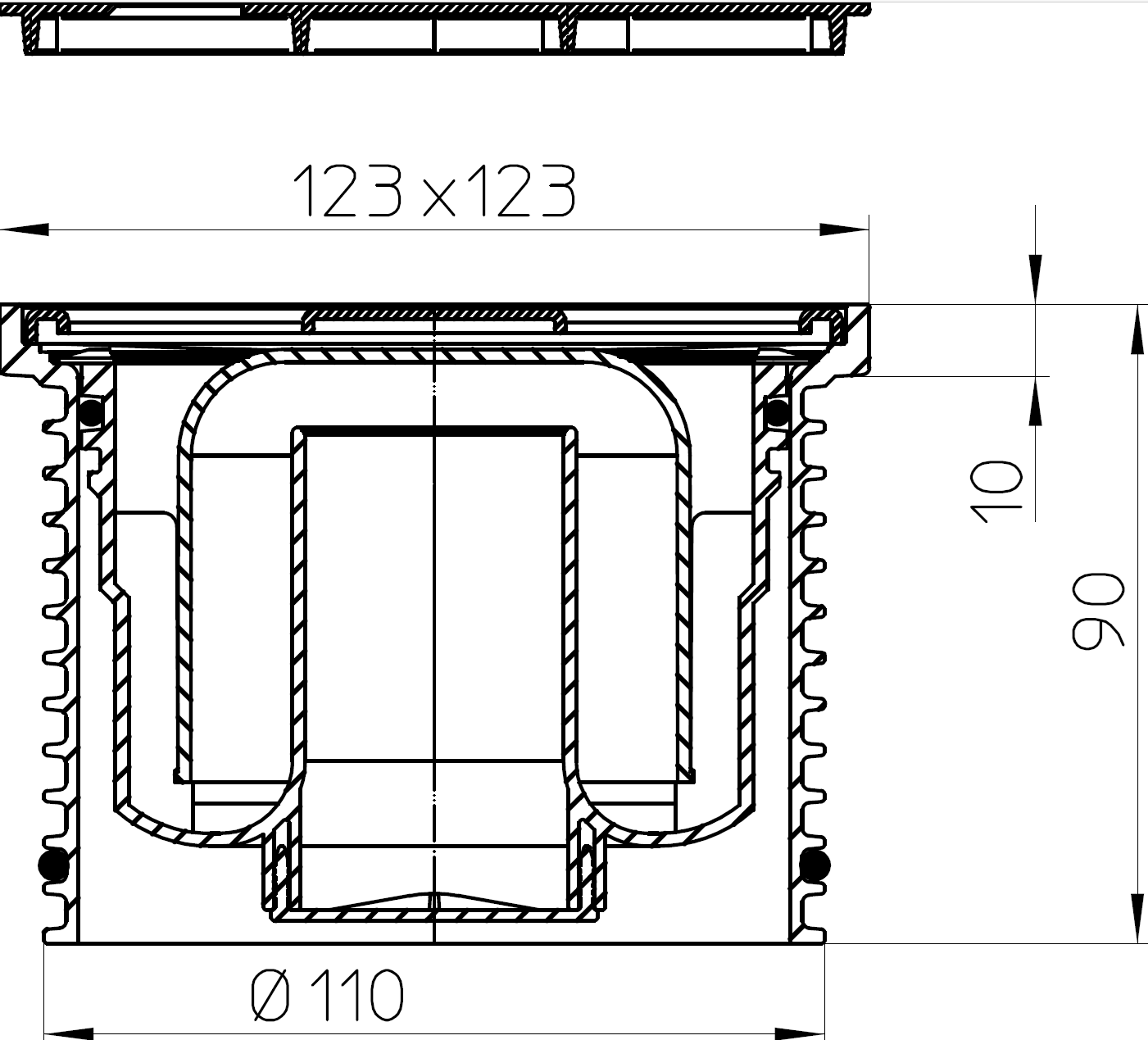 Rácstartó D110 mm / 123x123 mm műanyag kerettel,115x115 mm nemesacél lefolyóráccsal.