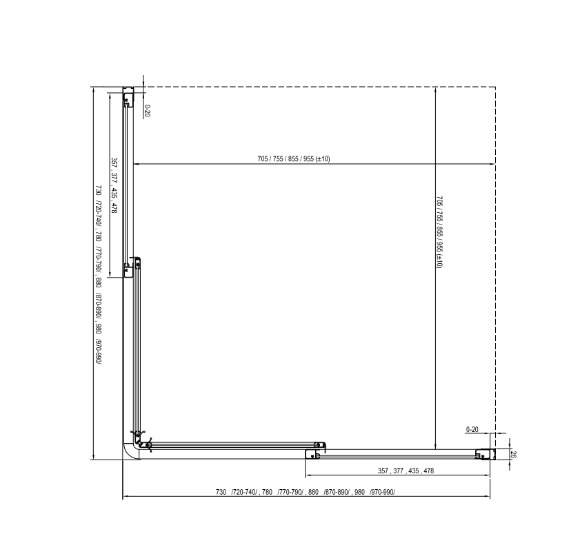 Egy teljes zuhanykabin kialakításához két darab SRV2-S tolóajtó szükséges. Mindkét rész különböző méretének kombinációjával négyzet vagy téglalap alapú zuhanykabint alakíthatunk ki (pl.: 75 x 90 cm, 90 x 90 cm, 80 x 100 cm és így tovább).