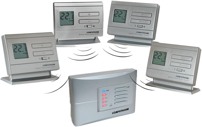 A Computherm Q5RF multizónás szobatermosztát csomagja két termosztátot és egy vevőegységet tartalmaz, mely szükség esetén még két Computherm Q5RF (TX) vagy Computherm Q8RF (TX) termosztáttal kiegészíthető. A vevőegység fogadja a termosztát kapcsoló jeleit, vezérli a kazánt valamint parancsot ad a termosztáthoz tartozó fűtési zónaszelepnek azon nyitására és zárására. A zónák egyszerre vagy akár külön-külön is üzemeltethetőek, melynek köszönhetően lehetőség van arra, hogy csak azok a helyiségek legyenek fűtve, melyeknél erre igényünk van. A termosztát lehetővé teszi a kapcsolási érzékenység megválasztását, hűtés és fűtés üzemmódok közötti váltást, valamint a belső hőmérő kalibrálását. Mivel a kapcsolatot a kazánnal rádiófrekvenciás összeköttetés biztosítja, így a termosztátok hatótávolságon belül hordozhatóak. Amennyiben a Q5RF termosztát által vezérelt fűtési rendszert kiegészíti Computherm S200 Wi-Fi dugaljjal és/vagy Computherm S300 Wi-Fi termosztáttal, abban az esetben okostelefonjával bárhonnan vezérelheti otthona fűtését, csupán internetre van szükség.