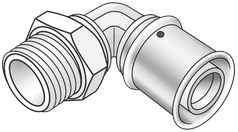Préselhető átkötőkönyök külső menettel, kóccal való tömítéshez, PPSU-ból (fehér), O-gyűrűs támasztóhüvelyekkel és nemesacél préshüvelyekkel.