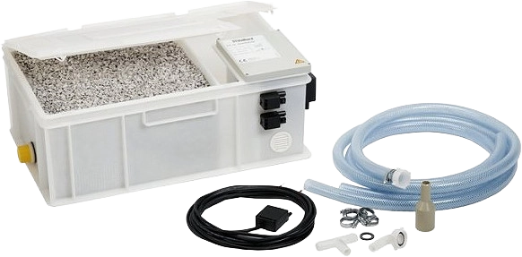 Kondenzvíz átemelő szivattyúval ellátott semlegesítő berendezés. Lefolyó (DN 20) és elvezető csővel (DN 20) ellátott műanyag tartály semlegesítő granulátummal feltöltve.